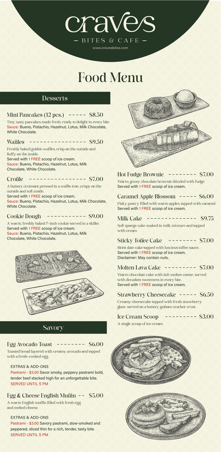At Craves Bites & Café, we bring together comfort, community, and flavor with a menu full of handcrafted coffees, refreshing mocktails, and indulgent desserts designed to satisfy every craving. Located in the heart of Scarborough, our cozy café is the perfect spot to relax with friends, enjoy a quick pick-me-up, or treat yourself to something sweet. With high-quality ingredients, a welcoming atmosphere, and a passion for making every visit memorable, Craves Bites & Café is where your cravings meet our delights.
